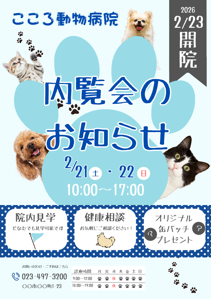 【自主制作】動物病院チラシ <ターゲット> ・動物を飼っている方へ・どの年代が見ても、親しみやすく <目的> ・動物病院を知ってもらう・内覧会のイベントを通して交流をしたい <制作> Canva Return